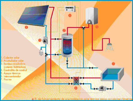 En el siguiente gráfico, puede ver el funcionamiento de una instalación de energía solar térmica con piscina climatizada.